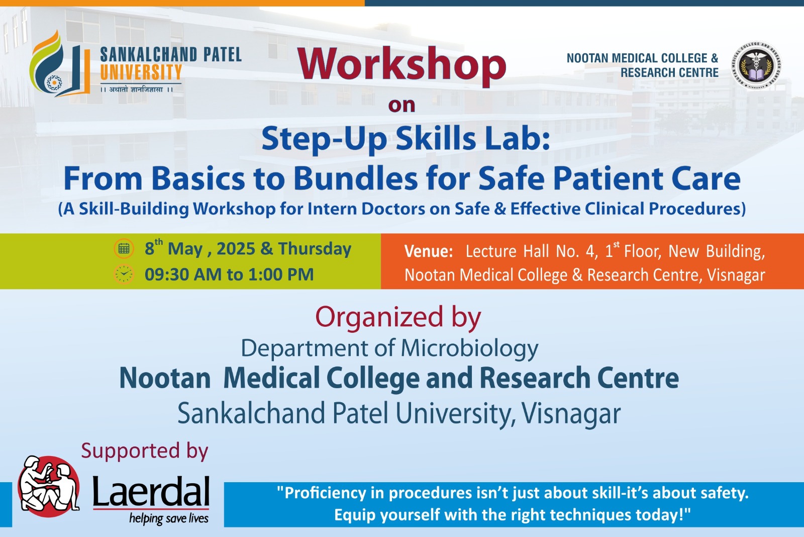 We are pleased to announce the successful completion of our hands-on workshop “Step-Up Skills Lab: From Basics to Bundles for Safe Patient Care” organized by the Department of Microbiology, Nootan Medical College and Research Centre, Sankalchand Patel University, Visnagar on 08 May 2025.